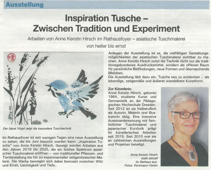 Von Januar bis Juni 2026 ist in der Rathausgalerie in Torgau die Ausstellung INSPIRATION TUSCHE von Anne Kerstin Hirsch zu sehen. mehr...