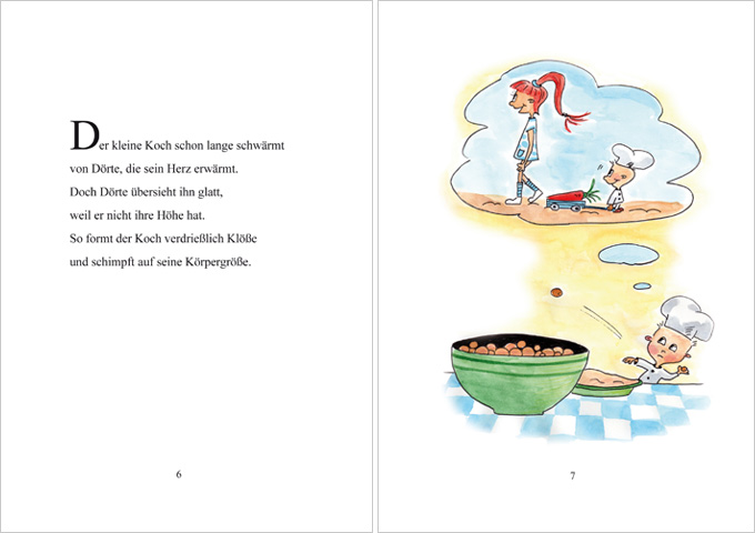 Der kleine Koch schwärmt für Dörte. Das Mädchen jedoch bemerkt ihn nicht einmal. Denn Dörte ist groß. Sie ist so groß, dass sie einfach über den kleinen Koch hinwegsieht.